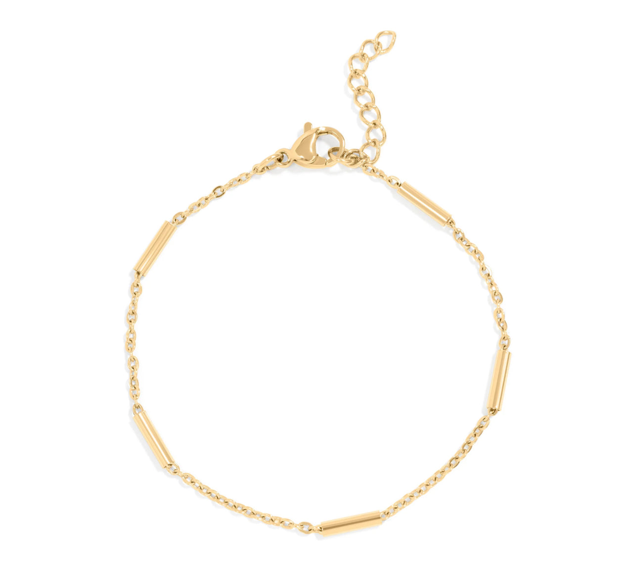 Elevate your everyday look with this 18K Gold PVD Stainless Steel Satellite Bar Chain Bracelet. Featuring evenly spaced gold bars along a fine chain, this sleek and minimal piece adds just the right touch of shimmer and structure to any stack. Durable, tarnish-resistant, and lightweight—perfect for layering or wearing solo.