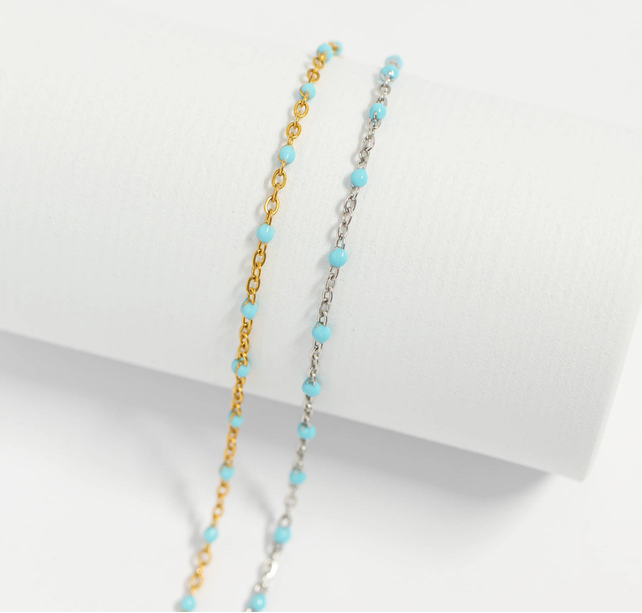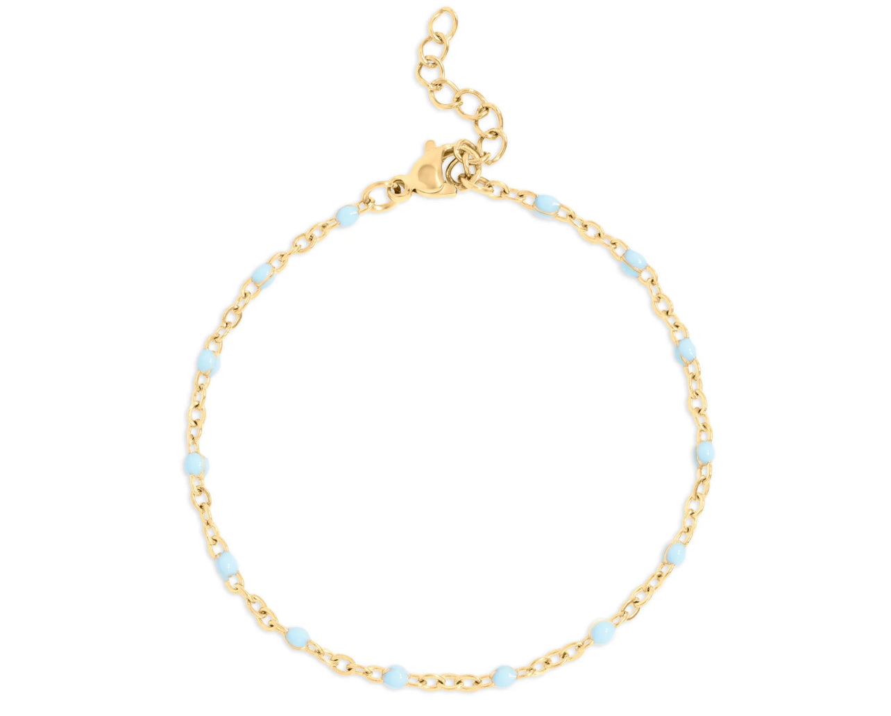 Add a touch of sparkle and sophistication with our 18K Gold PVD Stainless Steel Turquoise Confetti Bracelet. Featuring delicate Turquoise enamel accents that shimmer like scattered confetti, this bracelet is a playful yet elegant addition to any jewelry collection.