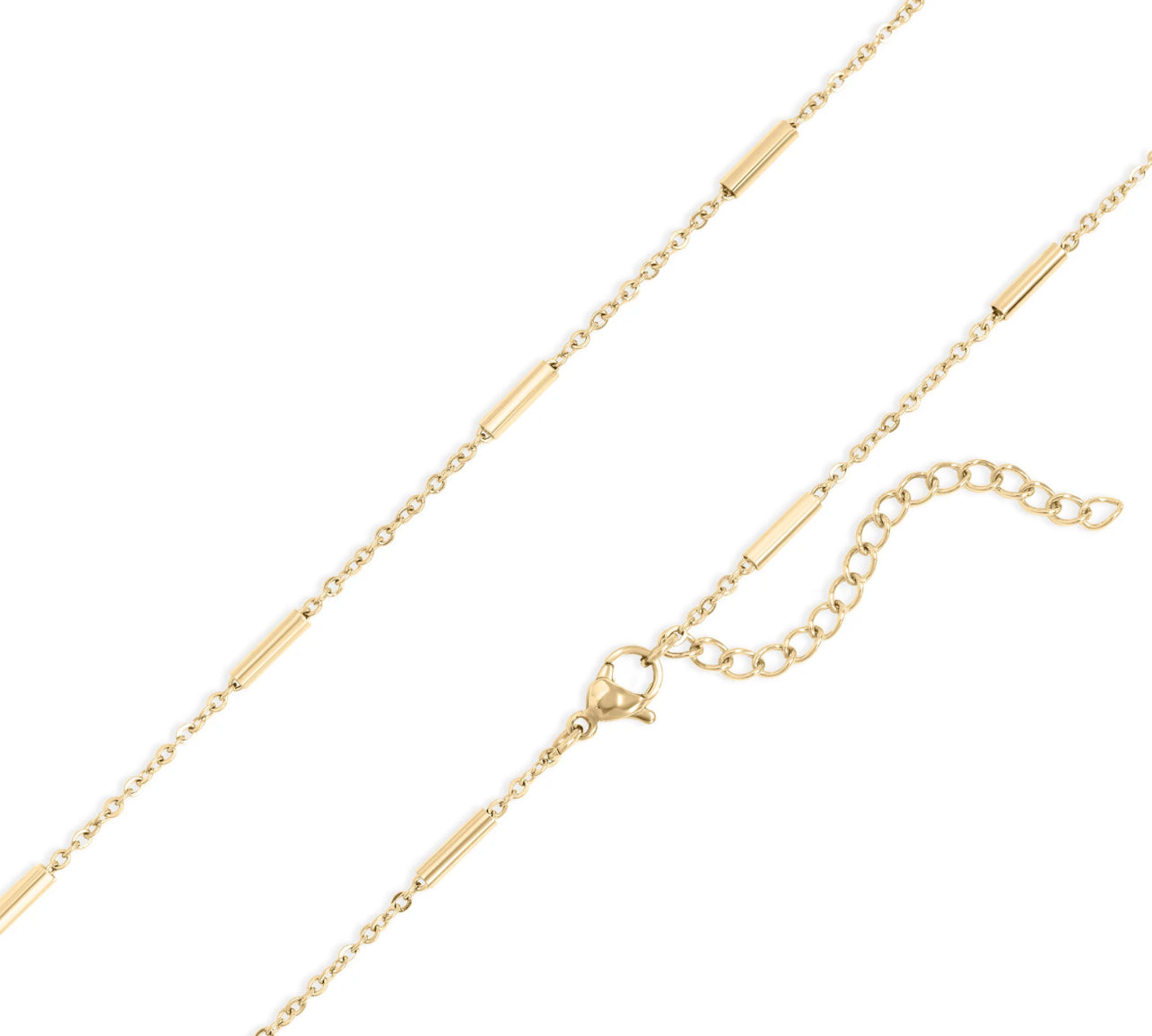 Sleek, minimal, and effortlessly chic. This satellite bar necklace is crafted from high-quality stainless steel and finished with a radiant 18K gold PVD coating for lasting brilliance. The slim horizontal bar sits elegantly on a dainty satellite chain, offering just the right amount of shimmer for daily wear or layering.